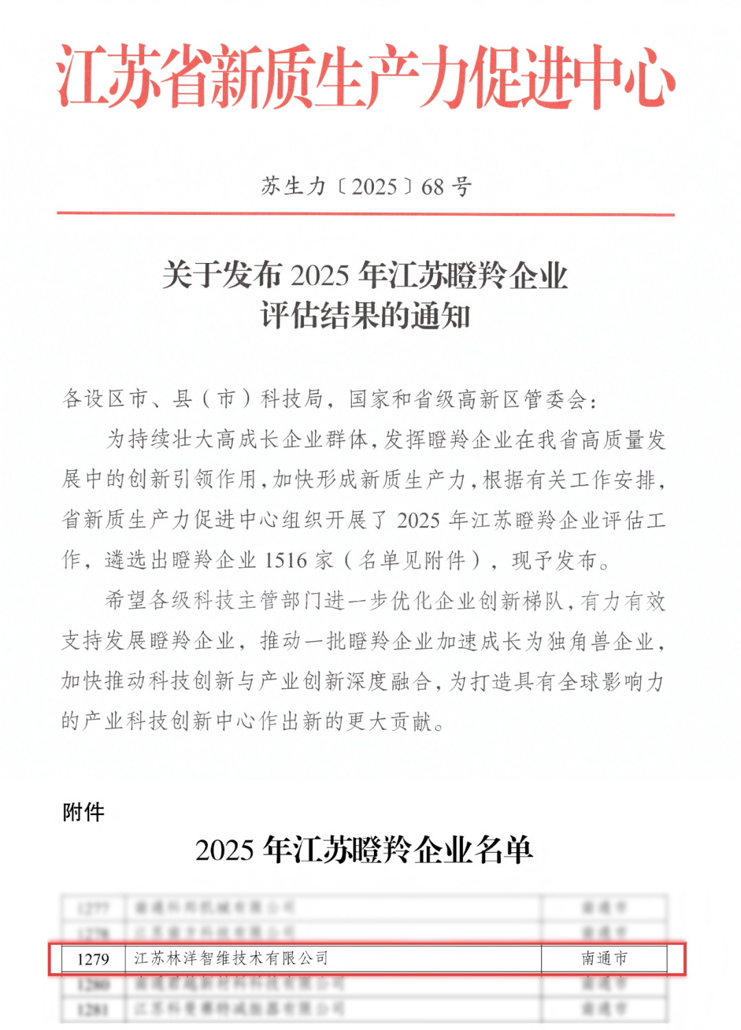 近日,江苏省新质生产力促进中心发布关于2025年江苏瞪羚企业评估结果,江苏林洋智维技术有限公司凭借卓越的创新能力与高成长性,荣耀登榜,获评江苏省“瞪羚企业”称号!