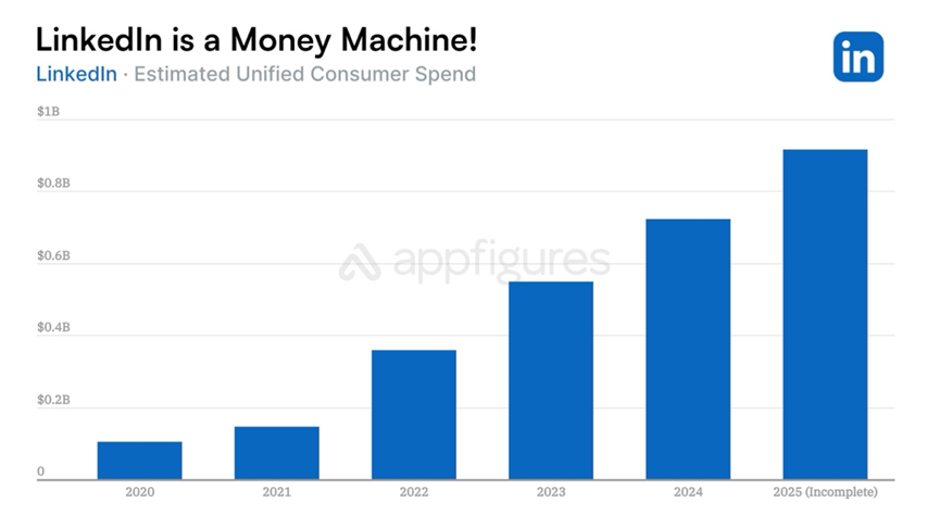 1、在多数社交平台仍为用户增长和盈利苦战之际,LinkedIn 正成为社交媒体中最赚钱的玩家。Appfigures Intelligence 数据显示,2025 年 LinkedIn 移动端消费者支出首次突破 10 亿美元,同比增长 35%,其 9 天收入即可超过 X(原 Twitter)一个月的表现。尽管下载量趋稳,LinkedIn 的每下载收入(RpD)却在持续飙升,从 2020 年的 1.43 美元提升至 2025 年的 12.40 美元,五年增长近 8.7 倍。核心动力来自不断增强的 Premium 订阅权益,包括 AI 求职工具、商业拓展功能等,为用户带来可量化的职业回报。(Appfigures)